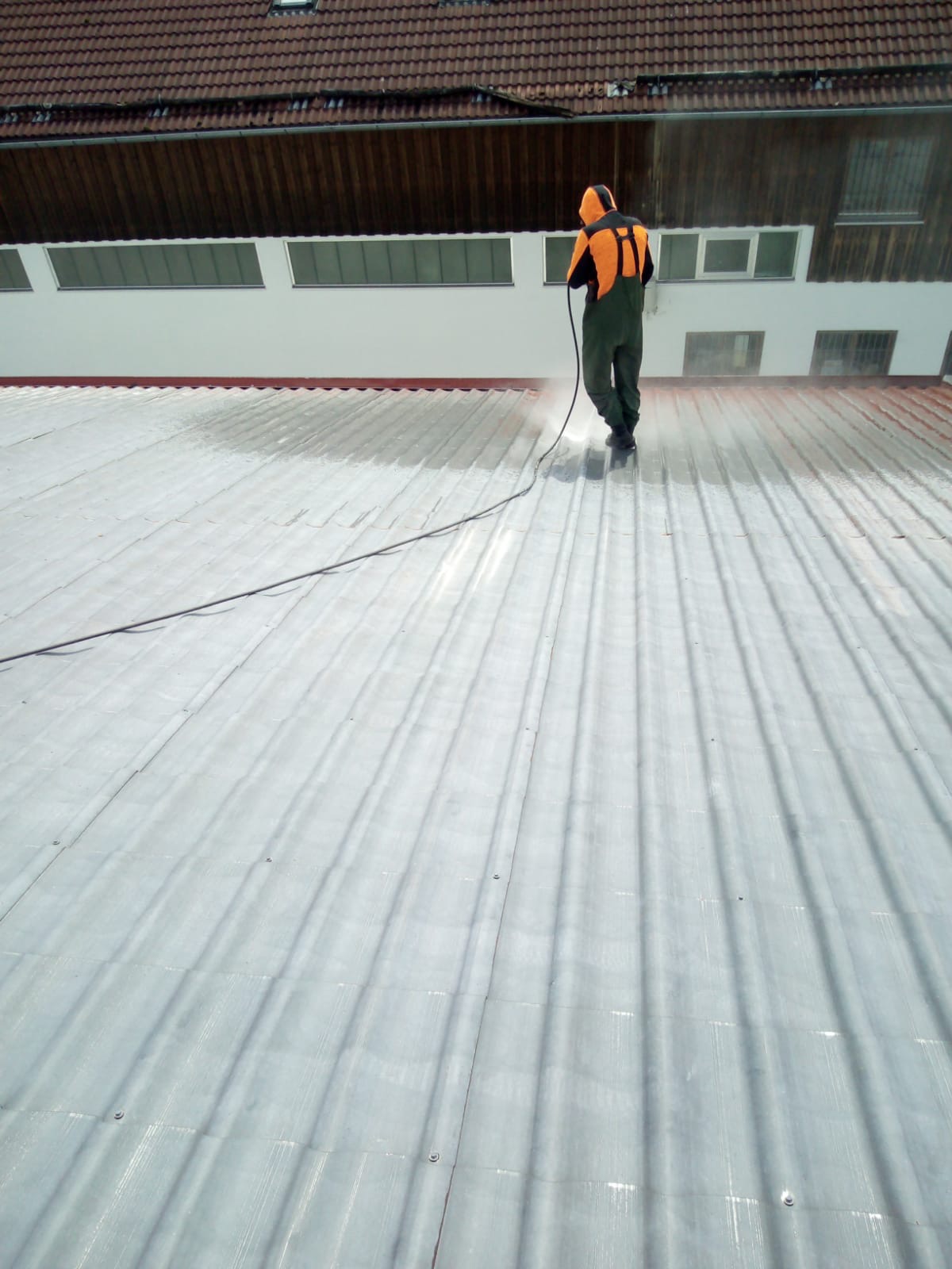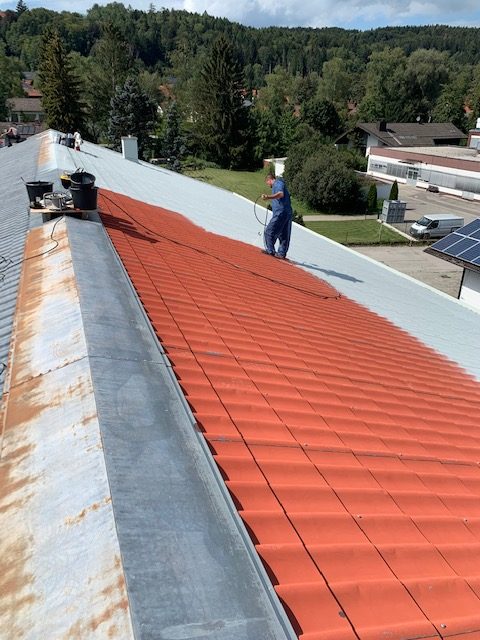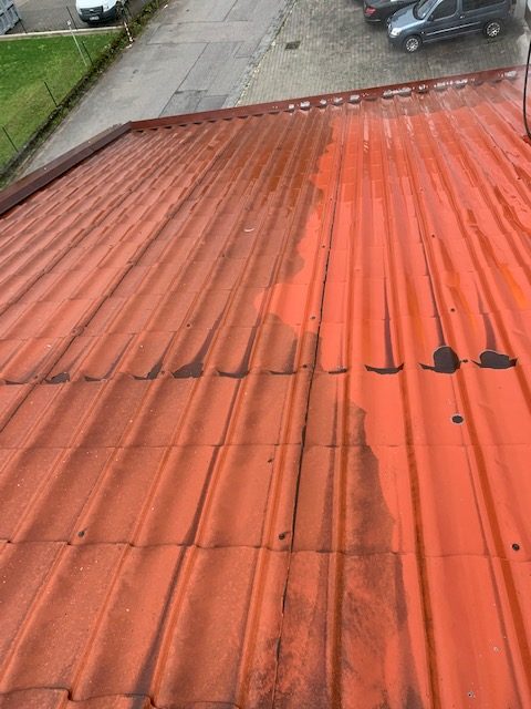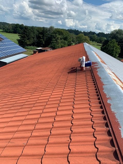 Bei der Dachreinigung kam unser Kalt und Heißwasser Hochdruckreiniger Dynajet 350TH mit bis zu 350 bar Arbeitsdruck zum Einsatz und das Dach wurde gründlich gereinigt. Im Anschluss wurde die Dachfläche nochmals überprüft und starke Korrosion nachgearbeitet d.h. grob abgeschliffen sowie alle Schrauben überprüft ggf. ausgetauscht und Ortgangbleche wurden befestigt.