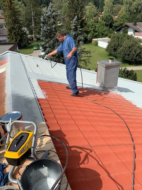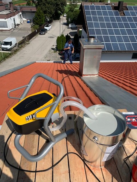 Unsere Dach-Beschichter mit langjähriger Berufserfahrung in der Dachbeschichtung haben die vorgegebene Menge gemischt und aufgetragen. Hierfür braucht es eine besondere Fachkompetenz. Nur so gelingt eine gute Dachsanierung.