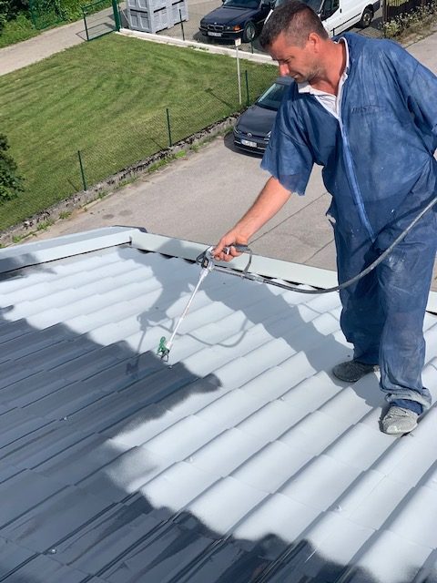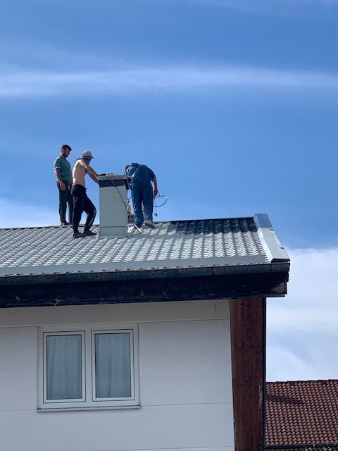 Bei Ankunft wurde eine Begehung und ein Probeanstrich auf dem Dach durchgeführt. Damit die Sicherheit gewährleistet ist, haben wir einen Auto-Krahn für diesen Tag geordert.