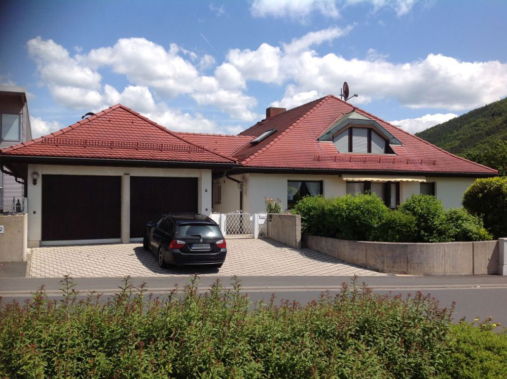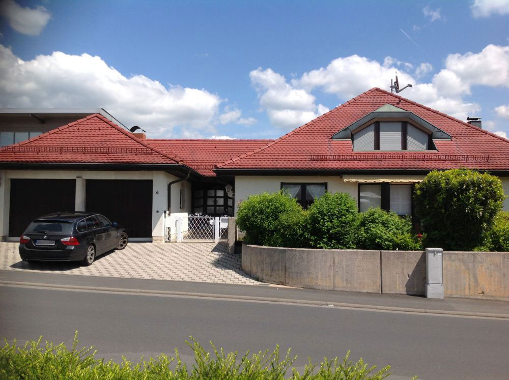 All unsere Arbeiten verfolgen eine Garantie von 10 Jahren – ein gutes Beispiel ist das von uns bearbeitete Dach in Lohr am Main. Gute 10 Jahre seit der Bearbeitung des Daches sind vergangen, trotzdem sitzen alle Betonziegel wie frisch gelegt und die Farbe leuchtet wie gerade erst aufgesprüht und getrocknet. Hier haben wir mit Bieberschwanz-Ziegel aus Beton gearbeitet, was ziemlich selten ist, da sie eigentlich aus Ton bestehen. Das Klassik-Rot leuchtet noch wie am ersten Tag!