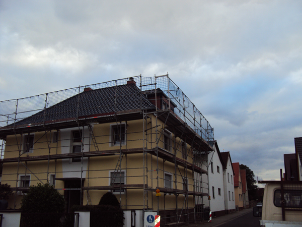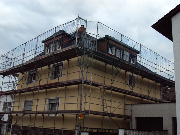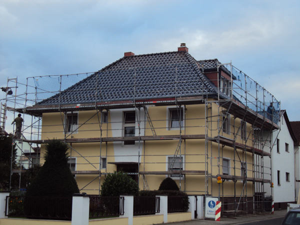 Im Hessischen Obermörlen in der Wetterau befindet sich dieses Haus, dem wir durch kundengerechte und wirtschaftliche Planung zu einem optimalen Ergebnis verhelfen konnten. Nicht das gesamte Dach musste neu gedeckt werden, sondern lediglich Grat und First wurden erneuert, also die obere Dachkante und die Ecken. Das sonstige Dach konnten wir vollständig reinigen und alles gemeinsam einheitlich beschichten. Der Eigentümer wählte dafür die Farbe Edelschwarz. An diesem Beispiel sehen Sie auch, wie gewissenhaft wir arbeiten. Ein professionell aufgebautes Schutzgerüst mit Fangnetz dient nicht nur der Sicherheit der in Ihrem Auftrag tätigen Mitarbeiter. Es ermöglicht auch eine ebenso präzises wie konzentriertes Arbeiten für ein optimales Ergebnis.