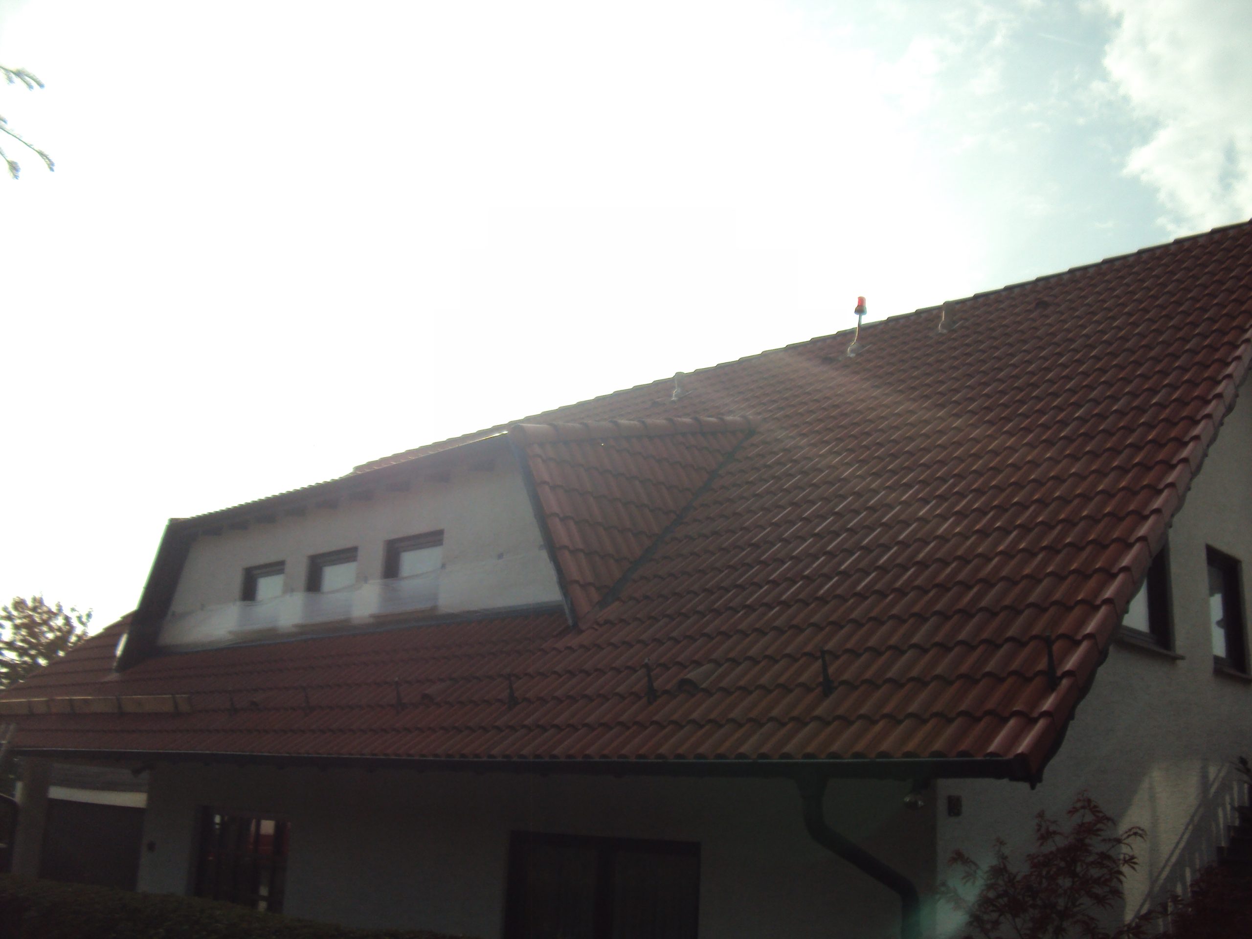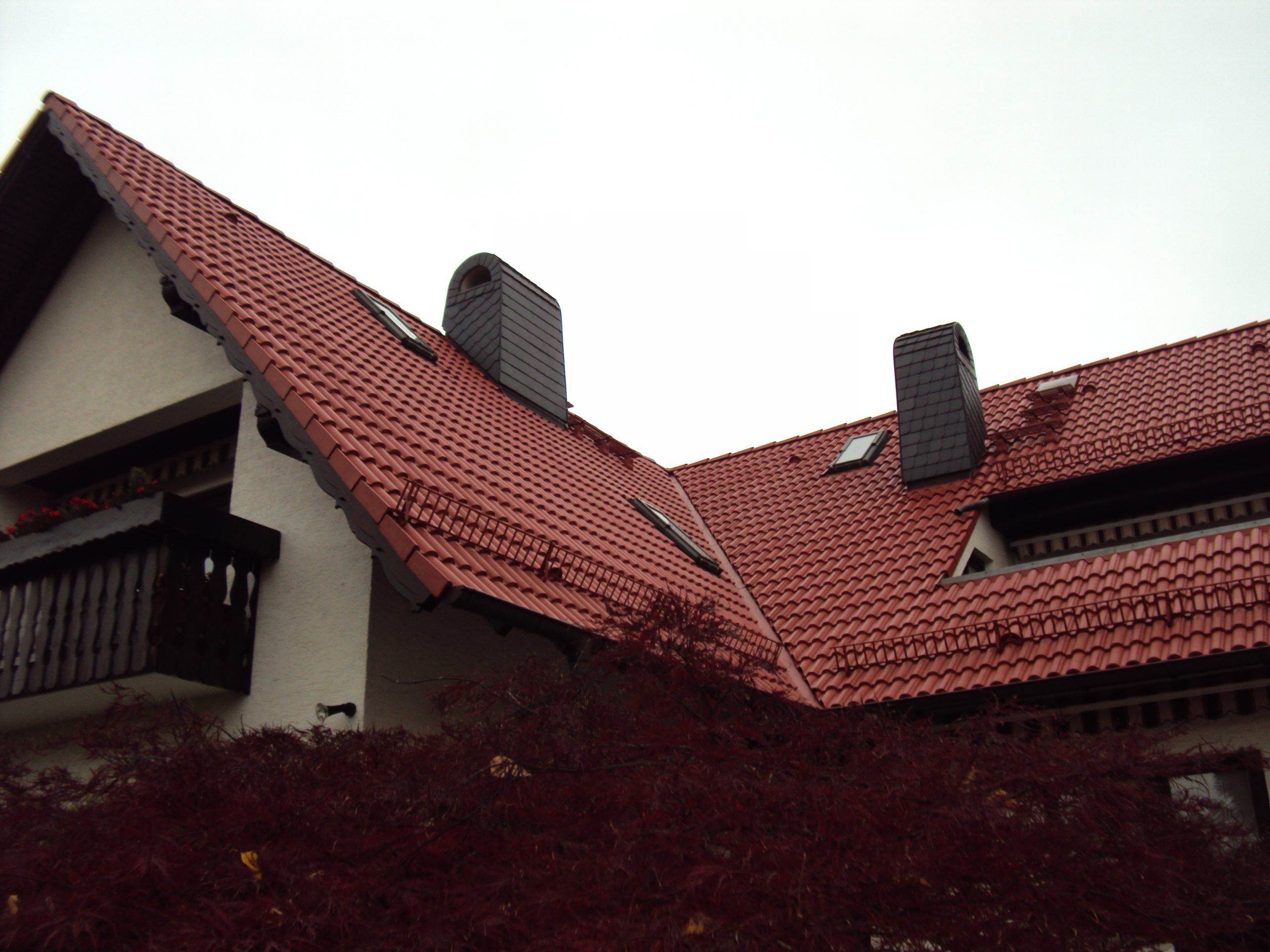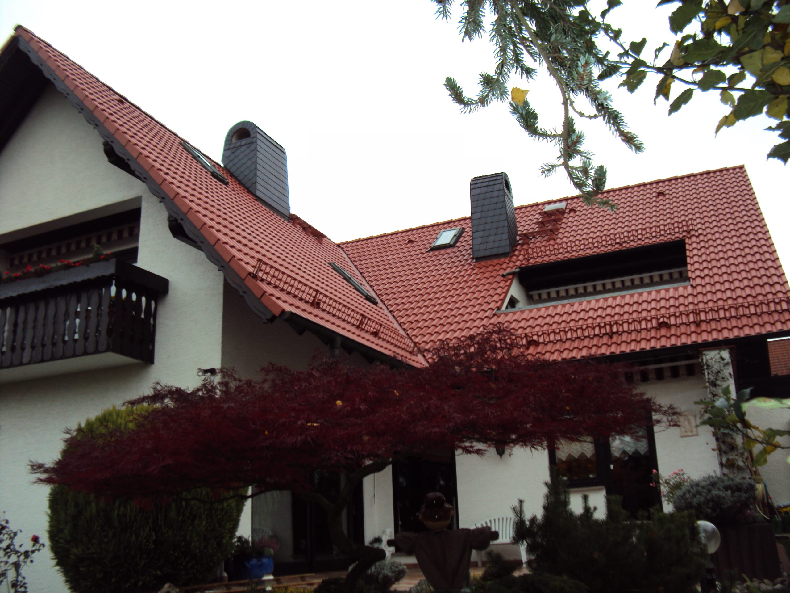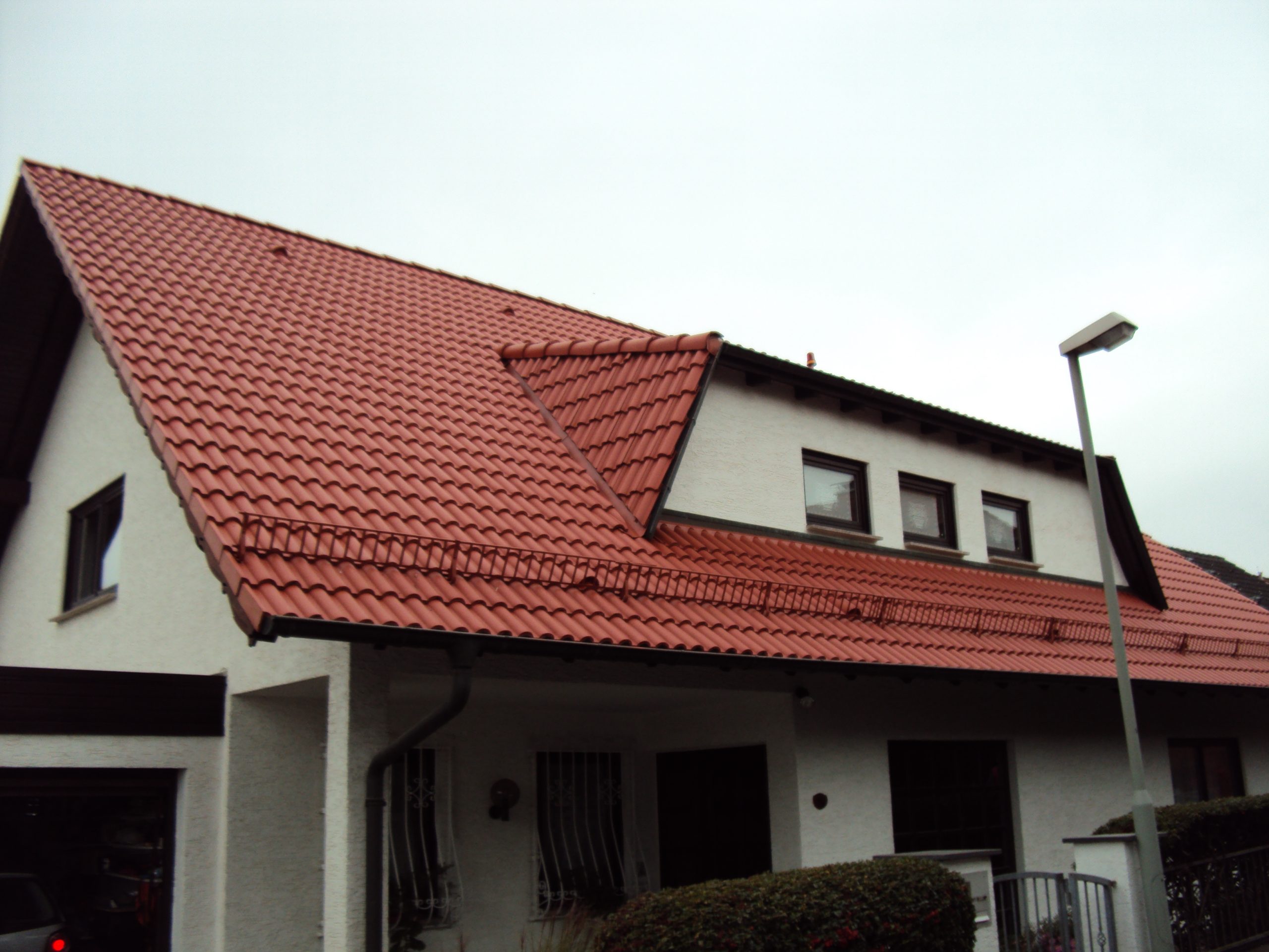Dieses großzügige Einzelhaus steht im Taunus. Es verfügt über ein Satteldach in L-Form mit Loggia, Gaube und zwei Schornsteinen. Wir haben das Dach gründlich gereinigt und einschließlich Gaube in Ziegelrot neu beschichtet. Die Schornsteine wurden bewusst als Stilelemente in dunkel beibehalten. Nach der Dachbeschichtung strahlt das Dach wieder wie neu. Unsere Garantie auf die Beschichtung: 10 Jahre!