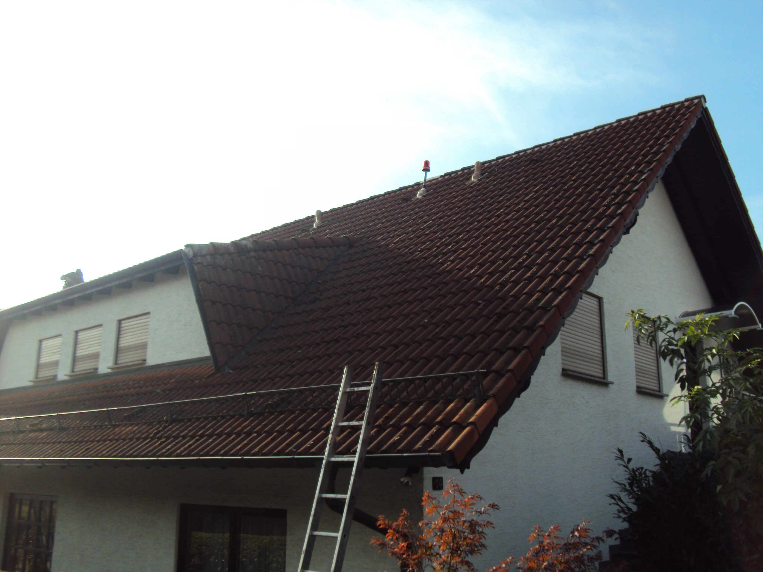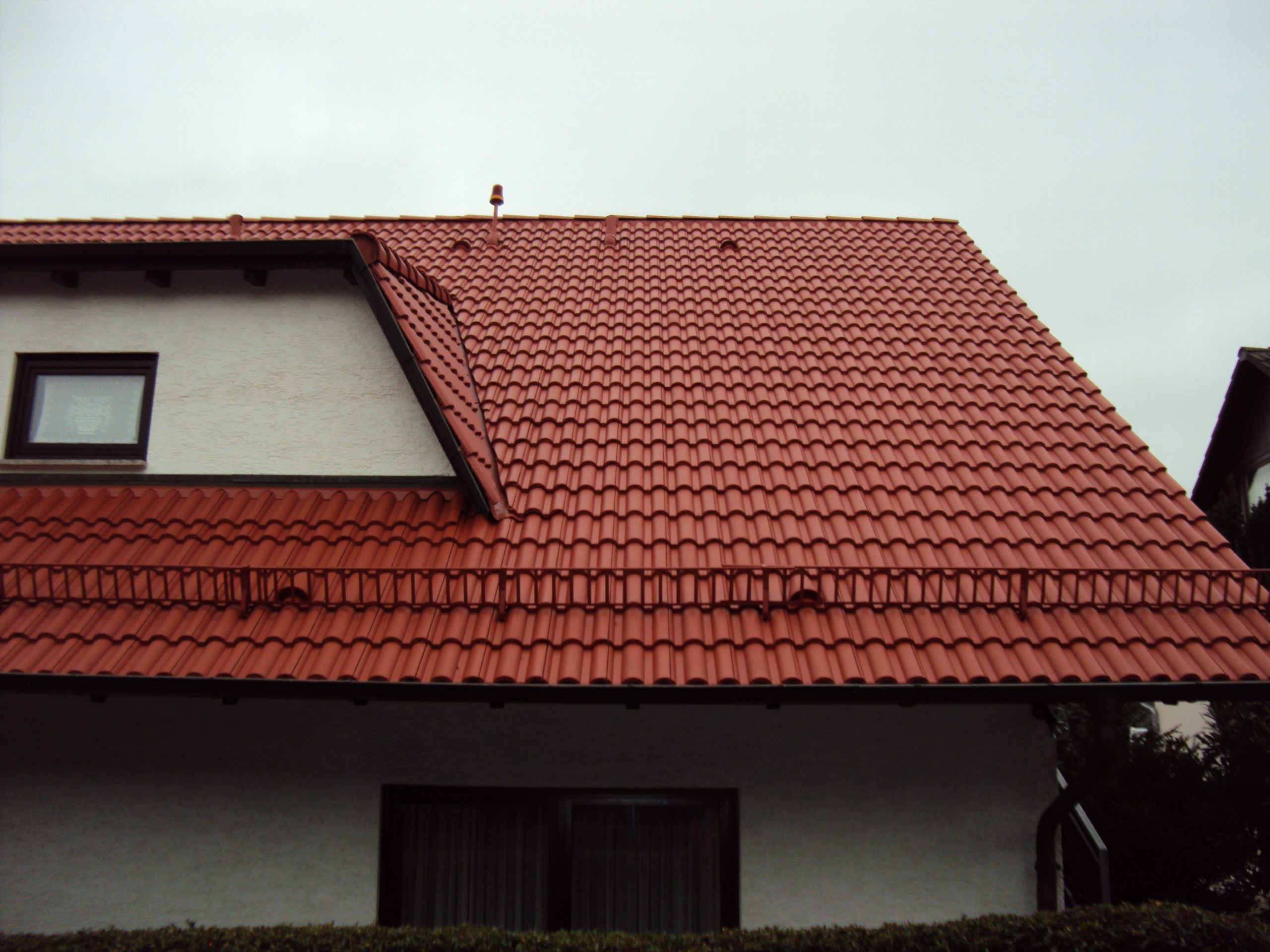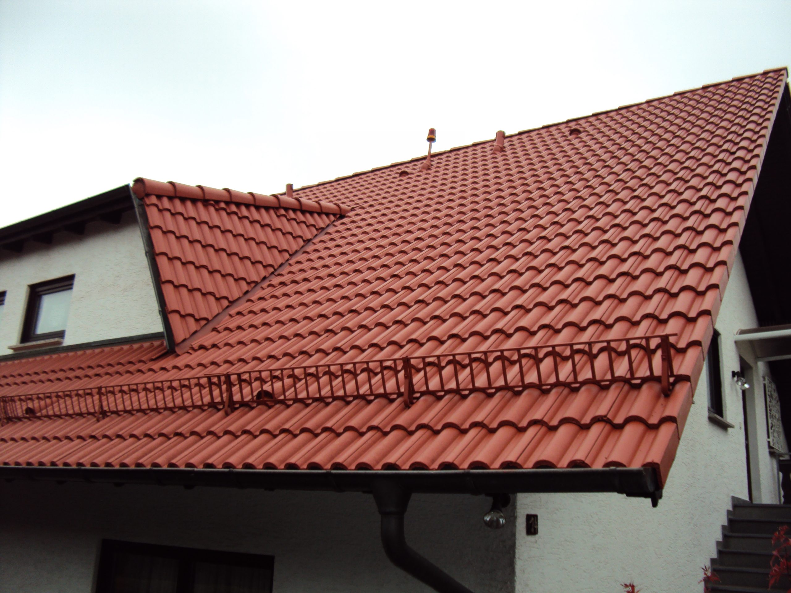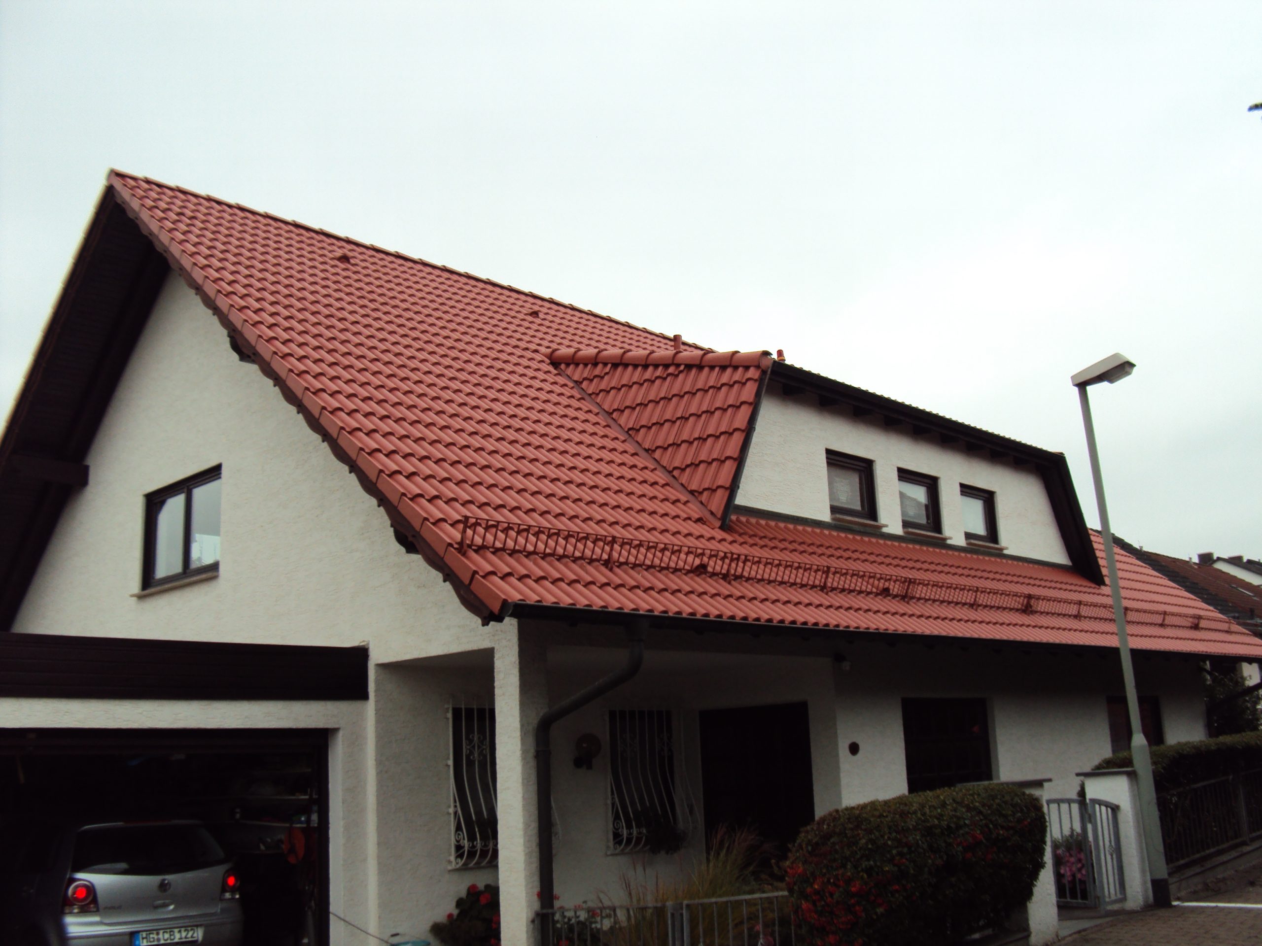 Dieses großzügige Einzelhaus steht im Taunus. Es verfügt über ein Satteldach in L-Form mit Loggia, Gaube und zwei Schornsteinen. Wir haben das Dach gründlich gereinigt und einschließlich Gaube in Ziegelrot neu beschichtet. Die Schornsteine wurden bewusst als Stilelemente in dunkel beibehalten. Nach der Dachbeschichtung strahlt das Dach wieder wie neu. Unsere Garantie auf die Beschichtung: 10 Jahre!