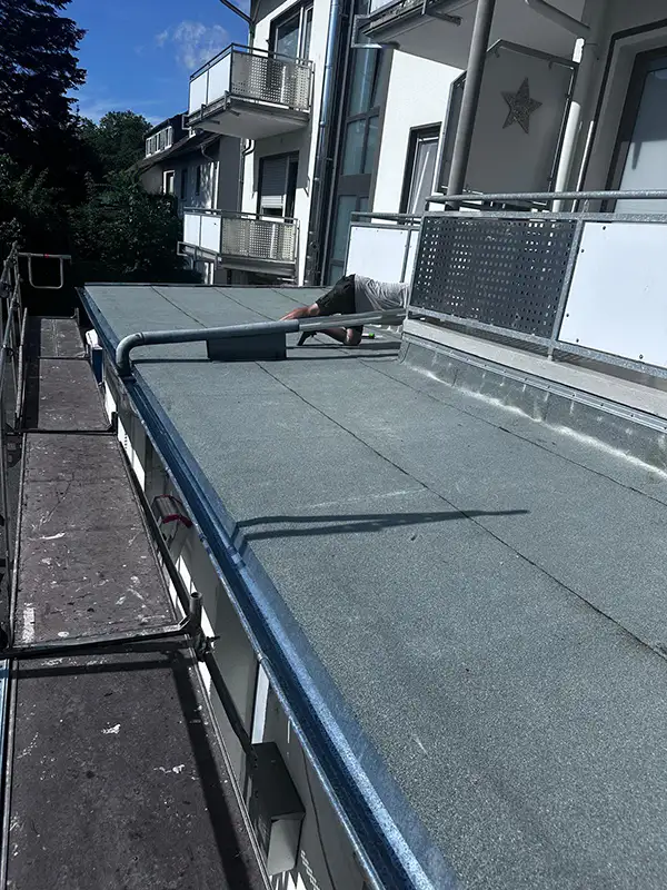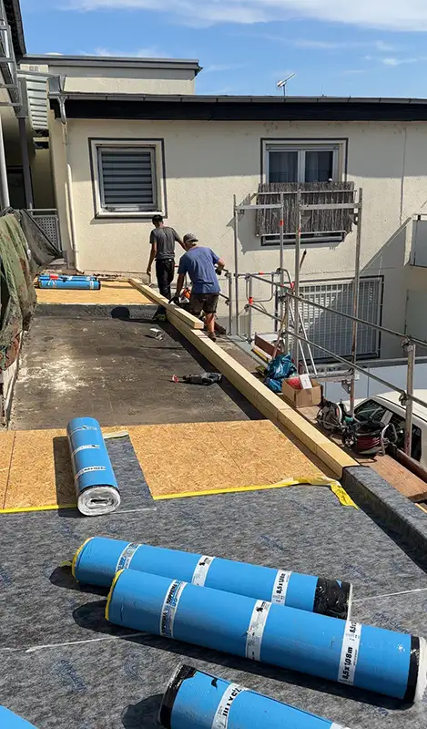 Mehrfamilienhaus mit Gewerbeeinheiten, dieses Objekt ist in die Jahre gekommen, die Dachverschalung wurde komplett entfernt und neu verschalt danach wurde die Dampfsperre Elastomerbitumen-Kaltselbstklebebahn Soprema angebracht, gedämmt und 2-fach abgedichtet inkl. Spenglerarbeiten. Eine fachgerechte Sanierung schützt das Gebäude vor Witterungseinflüssen und verhindert Folgeschäden.