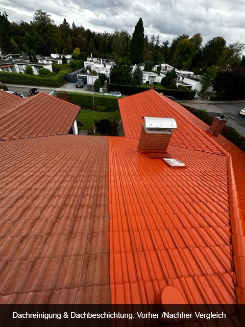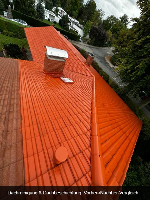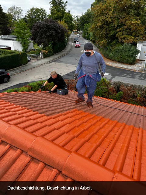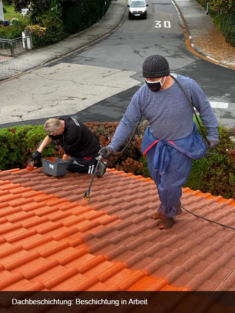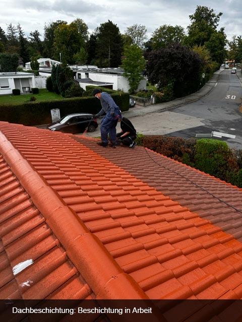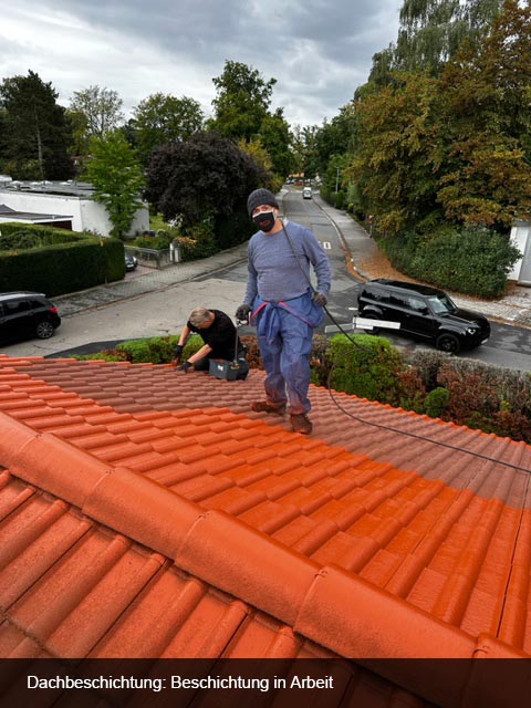 Dachreinigung und Beschichtung einer Fläche von 400m² Betonziegeln in ziegelrot. Dach war sehr stark vermoost. Schutzbleche in Dachrinnen eingehängt und Moos grob gereinigt. Alle Fallrohre abgeschraubt, das der Kanal nicht verstopft wird. Den Arbeitsplatz für die Beschichtung großflächig abgedeckt.- Dachbegehung und auf Undichtigkeiten überprüft