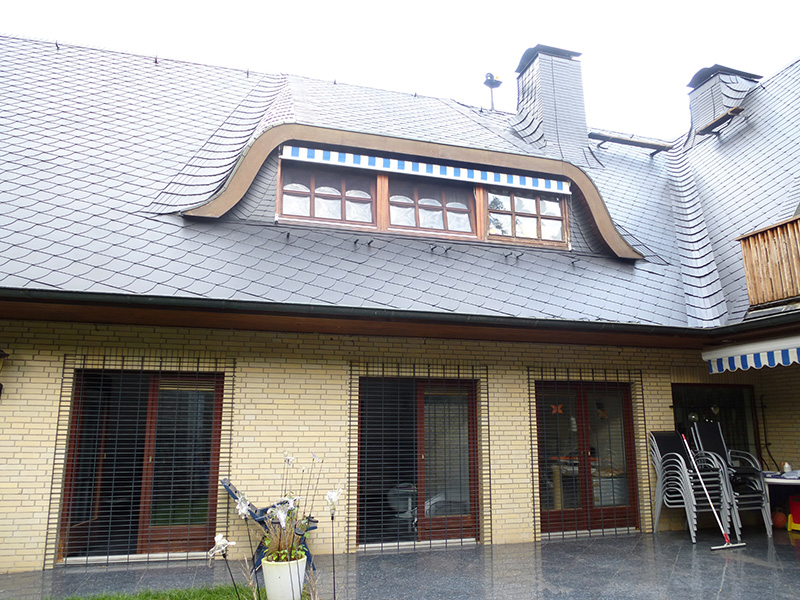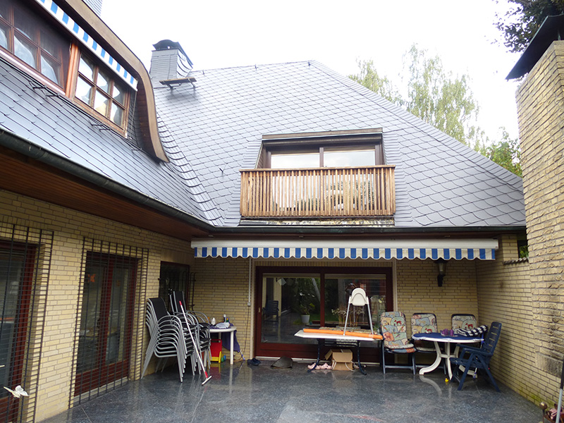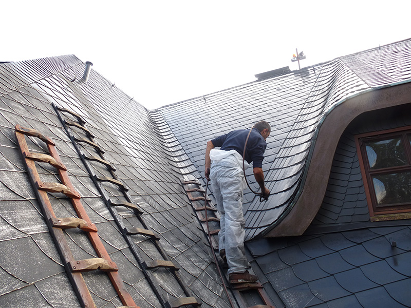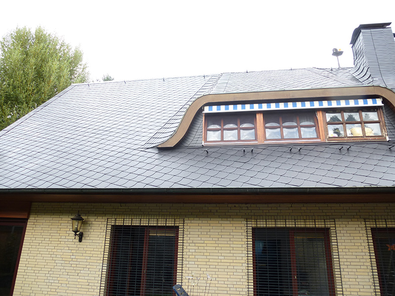 Sogenannter Kunstschiefer besteht nicht aus dem meist über Generationen haltbaren Naturgestein, sondern wird oft aus Faserzement hergestellt. Die Haltbarkeit ist hier in etwa vergleichbar mit der eines mit Tonziegeln gedeckten Daches. Durch eine Dachsanierung können wir die Lebensdauer des Daches wesentlich verlängern. Zu Beginn steht immer eine gründliche Reinigung. Es folgen Grundierung und Beschichtung. Das ebenso edle wie großflächige Kunstschiefer-Dach dieses Hauses haben wir, als Meisterbetrieb mit rund 20 Jahren Erfahrungen auf deutschen Dächern, fachmännisch saniert.